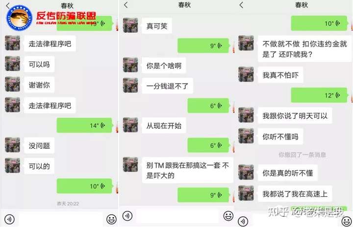 据该聊天记录显示,当投诉人与王某协商退款时,王某以“需要运营成本”为由扣除违约金,遭到投诉人的拒绝后,王某恼羞成怒,并告诉投诉人“从现在开始一分钱退不了、我们走法律程序”等言语威胁投诉人。