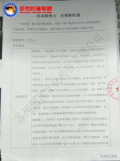 据投诉人签署的一份《抖动新势力、乐承新机遇》显示,“乐抖派”平台的服务商每开发一名新的商户奖励10元,新加入的商户享有免费使用300条推广次数,商户每使用一次推广次数,合作商享有0.5元/次的奖励。除此之外,据该活动计划书显示,服务商开发200名以上有限商户,公司奖励50%的技术服务费,开发400名以上的有限商户,公司则再奖励50%的技术服务费。