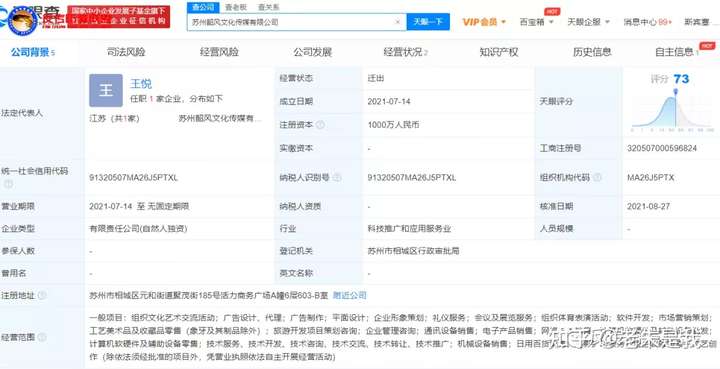 据天眼查显示,苏州韶风文化传媒有限公司成立于2021年7月14日,位于苏州市相城区元和街道聚茂街185号活力商务广场,注册资本1000万,实缴不详,法定代表王悦为实际控制人,持股100%。