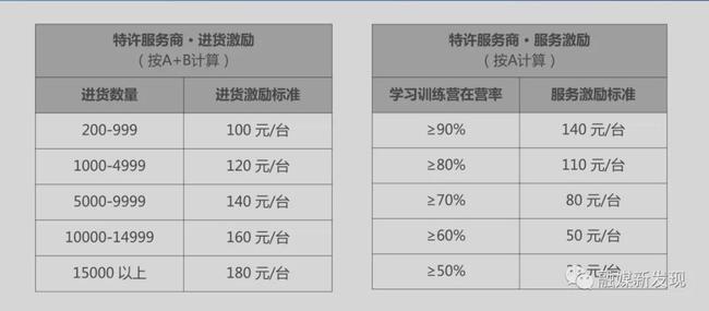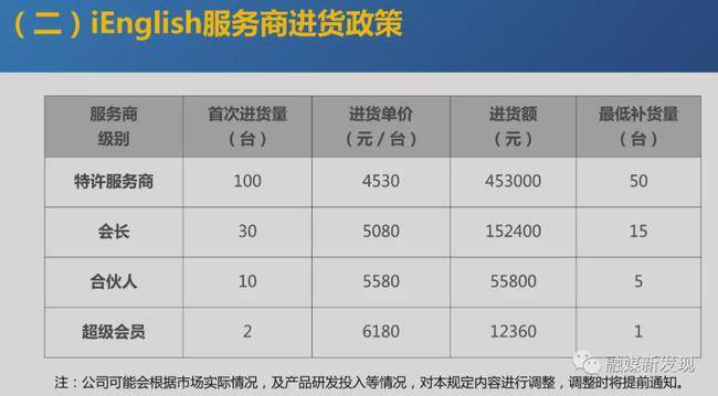 此外,iEnglish还有特许服务商激励政策,据iEnglish特许服务商激励政策说明显示,进货数量:特许服务商A,及其直接育成的所有特许服务商B,在一个考核期内的所有进货量;进货激励:根据特许服务商A+B的总进货量(须不低于200台),按照对应的级别,计算激励。服务激励:特许服务商A在离考核期结束前最后一个周日的学习训练营在营率,如果满足对应的条件,则可以在进货激励的基础上增加相应的服务激励。(当A能拿到进货激励,且A自己进货时,才享受服务激励,否则无效。)
