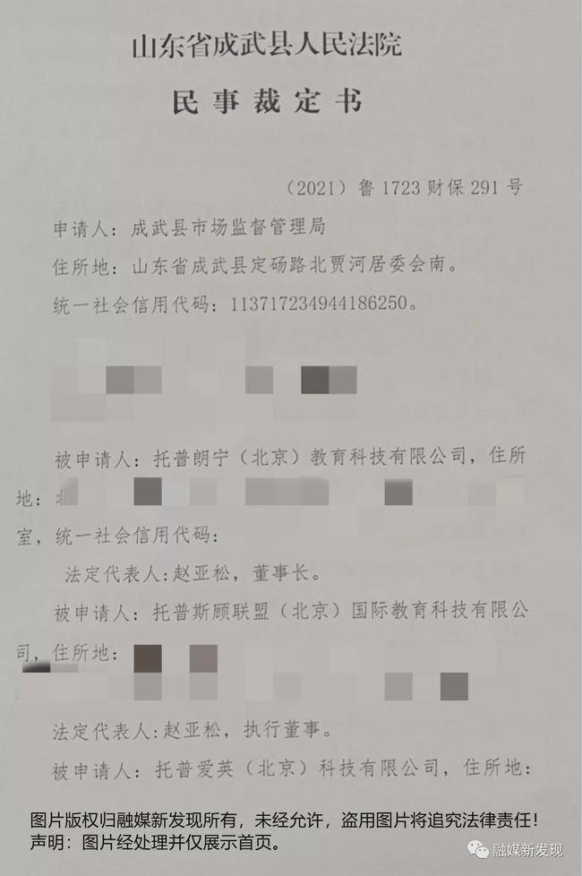 近日,融媒新发现接到知情人士透露,成武县市场监督管理局在查处托普朗宁(北京)教育科技有限公司等涉嫌传销一案时,为防止被申请人转移或者隐匿违法资金,向成武县人民法院提出申请,冻结被申请人托普朗宁(北京)教育科技有限公司、托普斯顾联盟(北京)国际教育科技有限公司、托普爱英(北京)科技有限公司、天津科阅科技有限公司、深圳市卓识教育管理顾问有限公司、赵某松、李某焰名下银行存款3.6亿元。