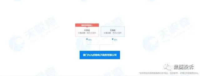 据天眼查APP显示,厦门九九拼购电子商务有限公司成立于2020年7月22日,注册资本为100万元,孙慧斌担任法人,持股65%,王晓聪持股35%。
