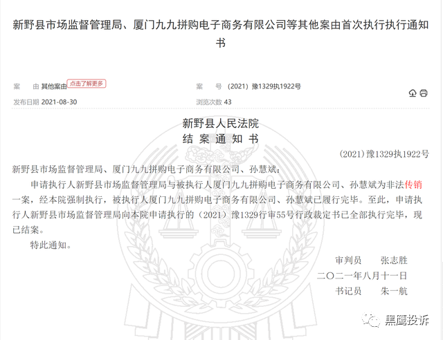 8月30日,中国裁判文书网公布一则题为《新野县市场监督管理局、厦门九九拼购电子商务有限公司等其他案由首次执行执行通知书》(简称:《执行通知书》)。