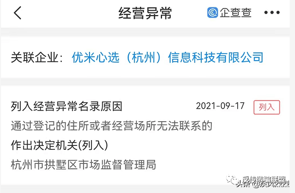 2021年9月17日,优米心选被杭州市拱墅区市场监督管理局列入异常。