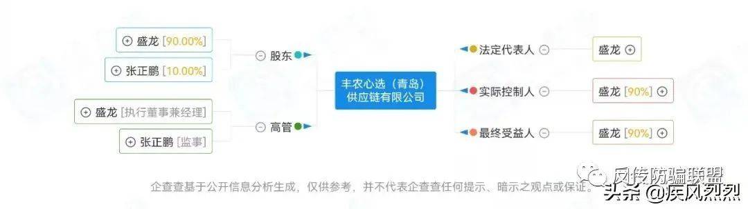 根据企查查APP数据显示,丰农心选(青岛)供应链有限公司成立于2021年8月27日,法人/执行董事兼经理盛龙,持股90%,监事张正鹏持股10%。