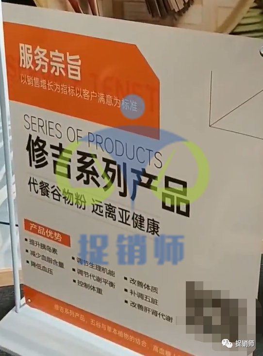 在会销现场视频中的宣传海报中有“修吉系列产品,代餐谷物粉,远离亚健康,产品优势:提升胰岛素、调节生理机能、改善体质、减少血脂含量、调节代谢平衡、补调五脏、降低血压、控制体重、改善肝肾代谢”。