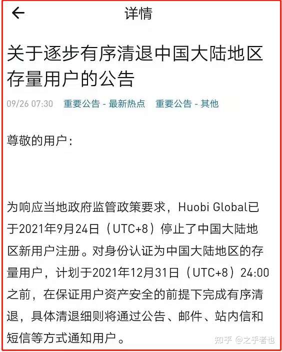 在人民银行和发改委的两条通告发布之后,火币于今天下午发布了公告:将停止大陆新用户的注册,并且会对大陆身份认证的存量用户进行清退,期限在2021年12月31日之前。