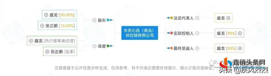 根据企查查APP数据显示,丰农心选(青岛)供应链有限公司成立于2021年8月27日,法人/执行董事兼经理盛龙,持股90%,监事张正鹏持股10%。