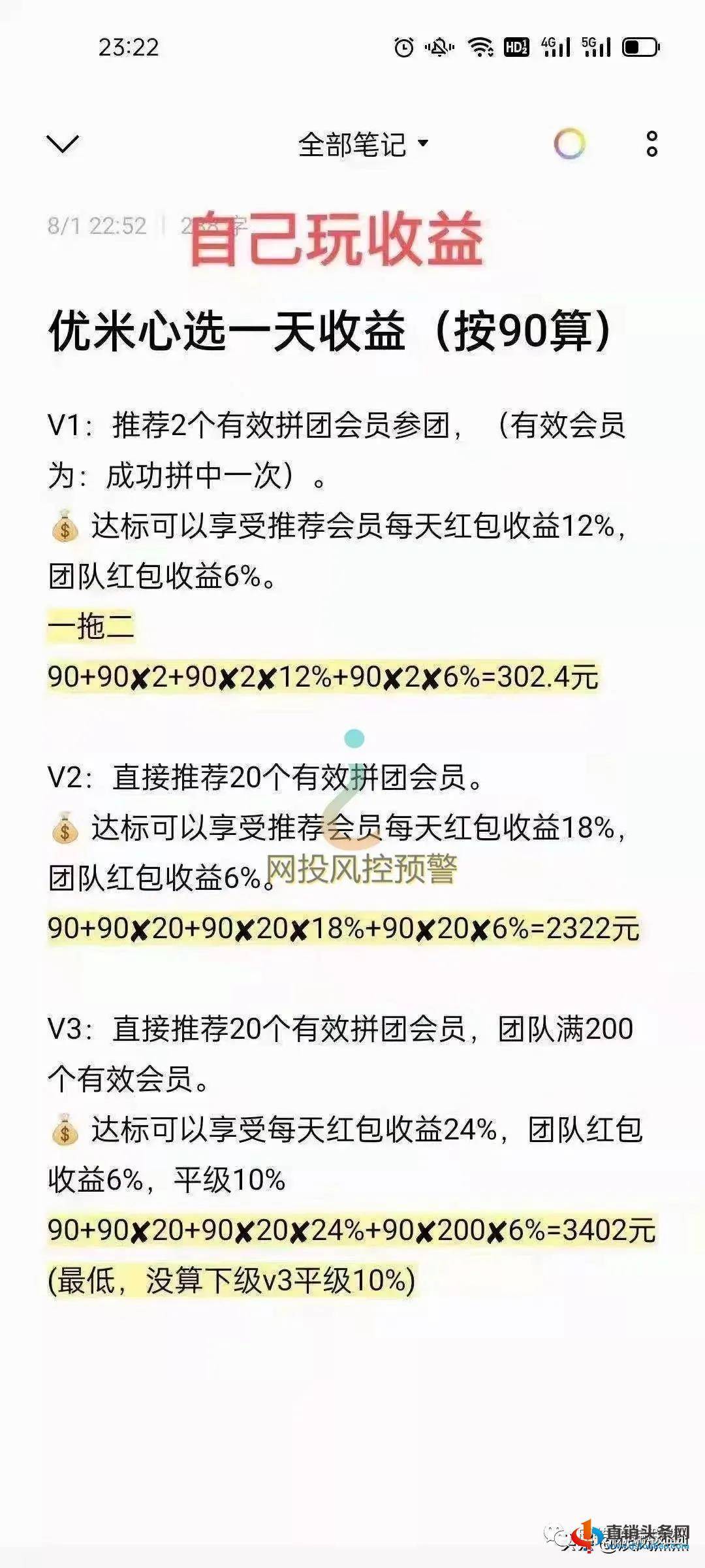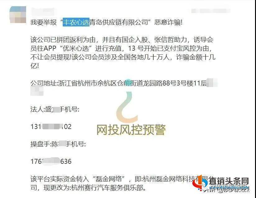 近日,网投风控预警收到相关知情人士提供的材料称,“丰农心选青岛供应链有限公司”涉嫌诈骗,该公司已拼团返利为由,并且有国企入股、张信哲助力,诱导会员往“优米心选”APP进行充值,13 号开始已支付宝风控为由,不让会员提现。该公司会员涉及全国各地几十万人,涉及金额达十几亿。
