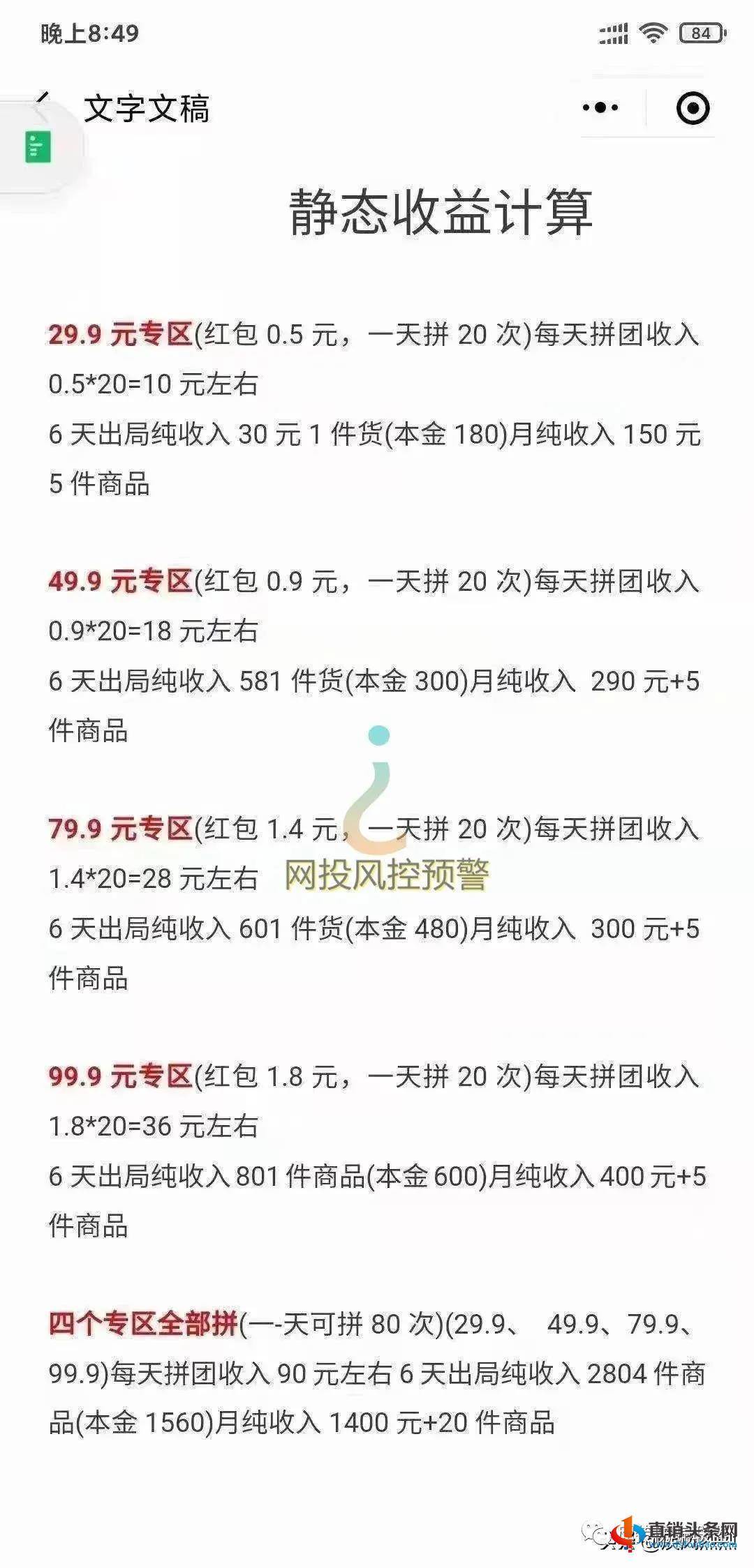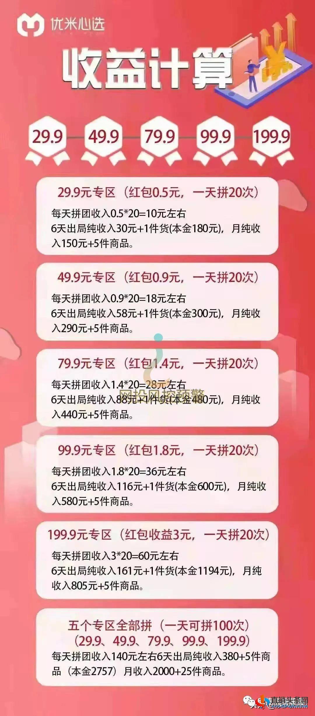 拼团专区分为四个区:分别是29.9元、49.9元、79.9元、99.9元门槛,每个专区每天可以拼20次。