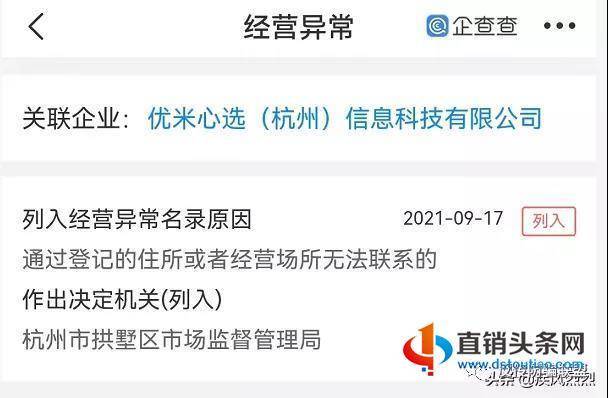 2021年9月17日,优米心选被杭州市拱墅区市场监督管理局列入异常。
