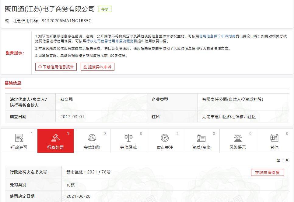 今年7月5日,聚贝通(江苏)电子商务有限公司因未依照《企业信息公示暂行条例》第八条规定的期限公示年度报告,被无锡市惠山区市场监督管理局列入经营异常名录。9月2日,该公司因通过登记的住所或者经营场所无法联系再度被无锡市惠山区市场监督管理局列入经营异常名录。