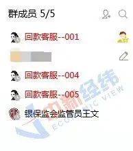 该客服人员进而将记者拉入一个小群,和孙女士提供的信息相同,群内除了三个客服人员外,同样有一个名为“银保监会监督员王文”的人出现在群中。