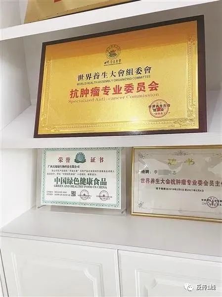 3月26日上午,记者来到天缘绿集团位于南宁北部湾科技园总部基地的办公点。在公司进门口的墙上,董事长李某的照片下写有“世界养生大会抗肿瘤专业委员会主任”“天绿元素品牌创始人”等头衔。会客厅摆有不少牌匾。其中一个聘书牌匾显示,世界养生大会组委会特聘李某为“世界养生大会抗肿瘤专业委员会主任”。