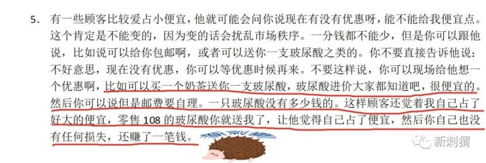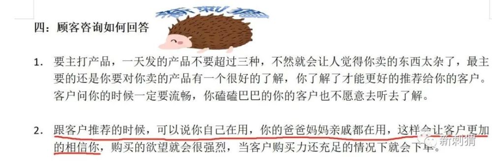 除了做噱头立人设外,MOS还设置了专门的小白培训课,主要就是针对刚入门的代理商教他们如何经营朋友圈卖货。内容从发圈的频率到时间内容以及话术都有涉猎,最让小编瞠目结舌的是在培训课件中多处地方都公然标注出应对消费者的疑问该用怎么样的话术来忽悠消费者从而达到卖货的目的。