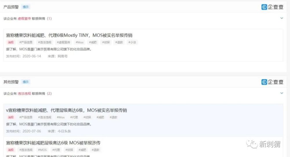 公开资料显示MOS品牌是厦门美莎贸易有限公司旗下的化妆品品牌,根据企查查公开信息显示该公司不仅有2起被起诉审理的企业纠纷案件,还有多项涉及敏感舆情的相关信息,提醒MOS公司涉传和虚假宣传。