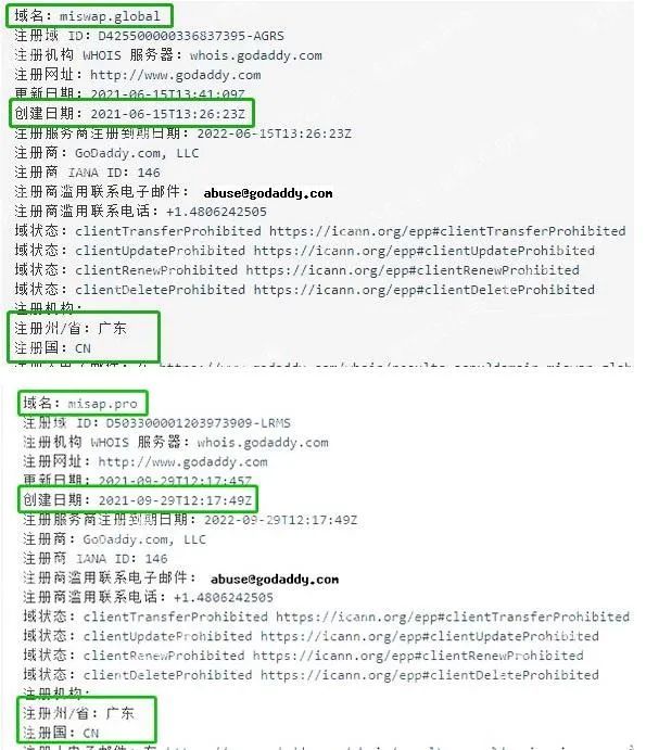 水星Miswap目前使用过两个域名,其中一个.pro的正在用来挖矿,另一个.global的说是官网域名,但是目前根本就打不开!!经查询,这个项目的两个官方域名的注册地都是在中国广东。