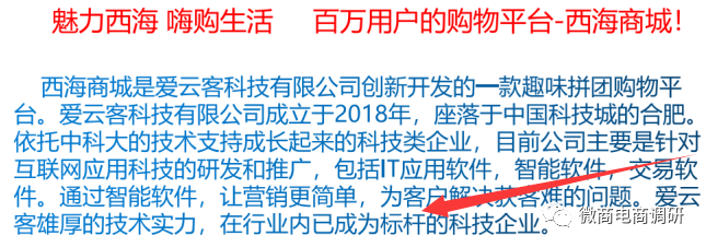 在本篇报道中,我们了解到了多彩嗨购和西海商城之间的关联,以及爱云客公司在自我介绍时是否存在矛盾,在下篇报道中,我们将着重关注的是西海商城APP中的拼团商品的价格是否虚高,请继续关注微商电商调研。反传销彭柱团队转载!