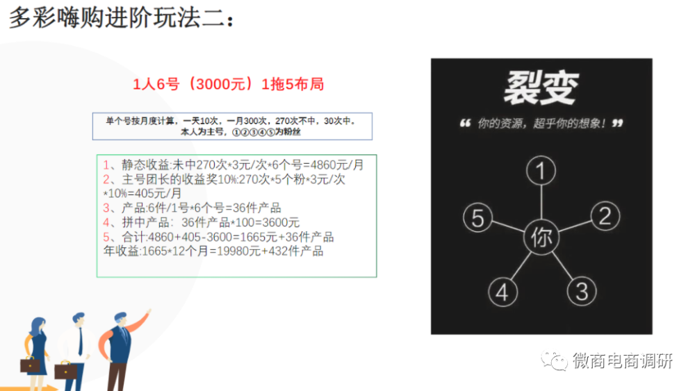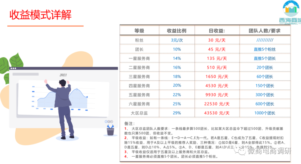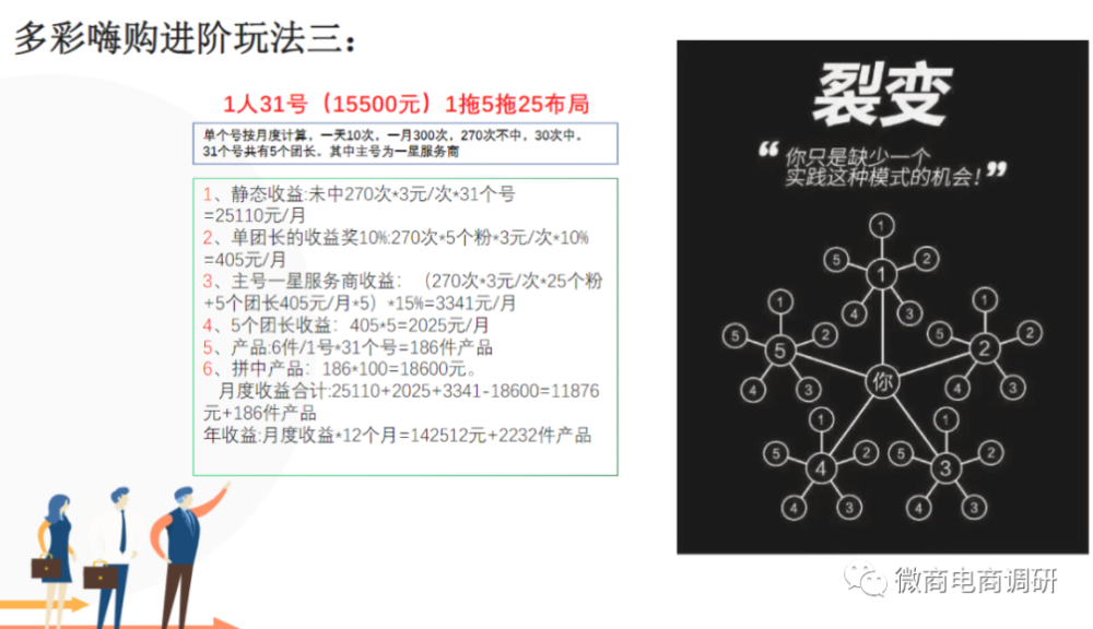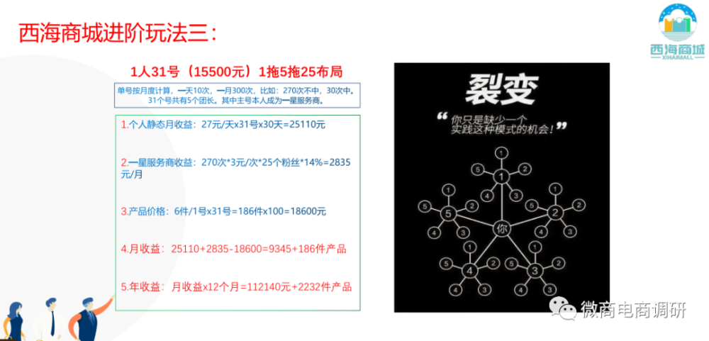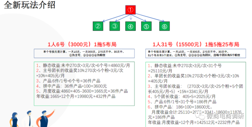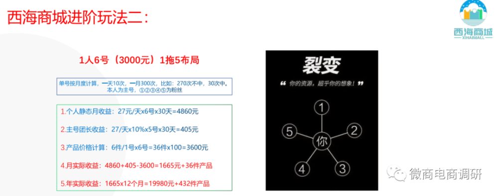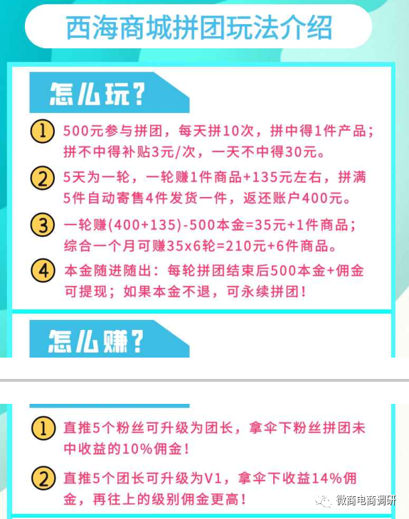 通过制度对比,我们不难发现两者间在制度方面的相同之处,大体模式上基本雷同,唯独个别数字存在差异。而说到具体玩法,两者间更显得是别无二致,1人6号、1人31号的说法,乃至图片版式的设计,都无外其中。看完了多彩嗨购的玩法,接下来,我们再说回《西海商城收益模式》介绍的玩法: