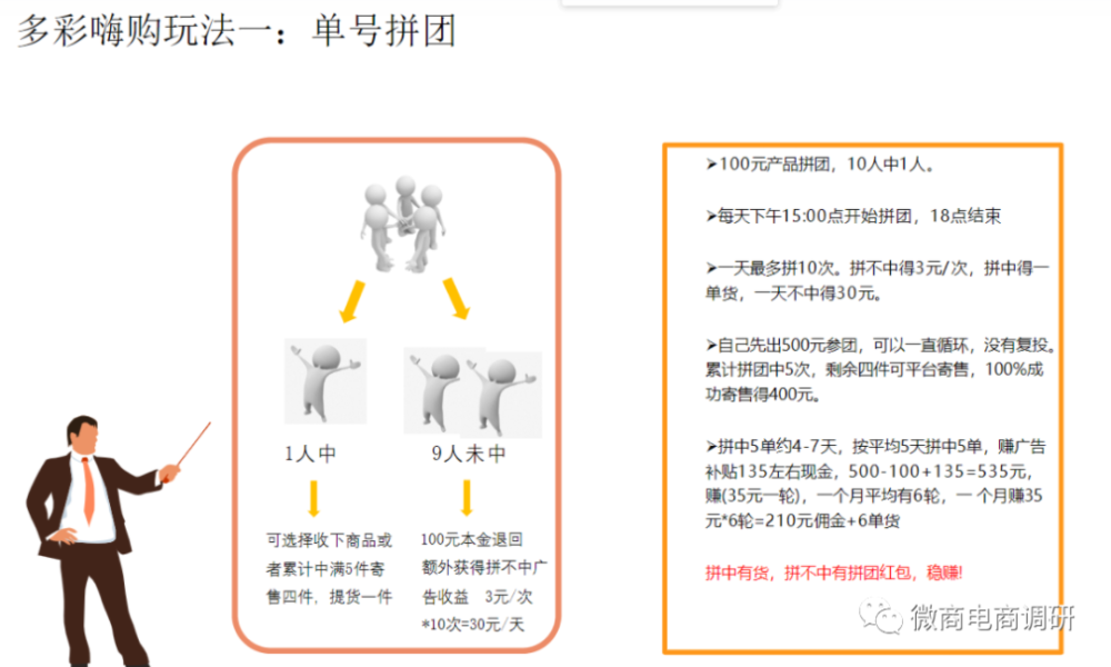 第一,500元参与拼团,每天拼10次,拼中得1件产品;拼不中得补贴3元/次,一天不中得30元。