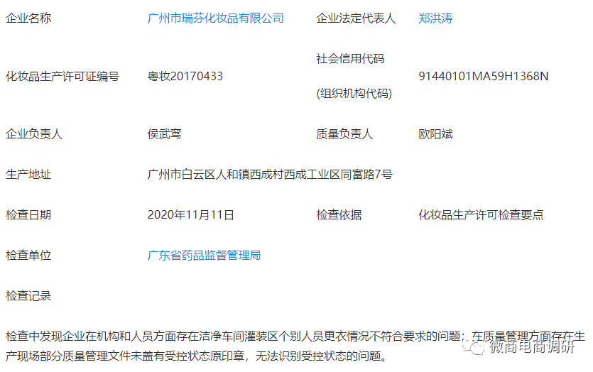 顺带一提,蜜诗艾妮玫瑰补水修护喷雾这款产品的实际生产企业广州市瑞芬化妆品有限公司也曾被曝出过问题,在2020年化妆品生产企业飞行检查中,该公司因为在机构和人员方面存在洁净车间灌装区个别人员更衣情况不符合要求的问题并且在质量管理方面存在生产现场部分质量管理文件未盖有受控状态原印章,无法识别受控状态等问题违反了《化妆品生产许可检查要点》的有关规定被相关部门责令整改。
