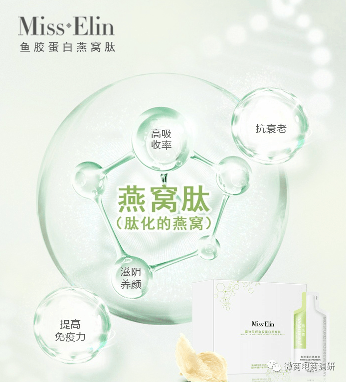我们先以食品举例,在公众号“Miss Elin蜜诗艾妮”中,该产品所含有的成分花胶和燕窝肽被包装为具有提高免疫力的功效。