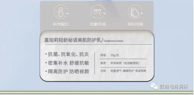 嘉珀莉“轻龄秘语”系列的另一产品嘉珀莉轻龄秘语美肌防护乳在微信小程序“嘉珀莉商城”中被描述到:该产品能够防晒防紫外线,并且还能够抗菌抗炎。