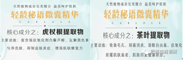 在公众号“法国嘉珀莉”中,嘉珀莉轻龄秘语微囊精华的成分虎杖提取物、茶叶提取物和光果甘草提取物被介绍为能够美白,甚至还能够抑菌消炎、抑制皮肤炎症。