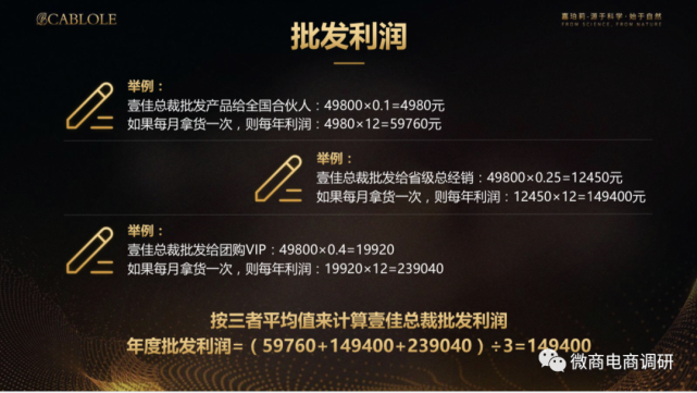 省级总经销:获得团购VIP复购产品15%的级差利润;全国合伙人:获得省级总经销复购产品15%的级差利润,获得团购VIP复购产品30%的级差利润;壹佳总裁:获得全国合伙人复购产品10%的级差利润,获得省级总经销复购产品25%的级差利润,获得团购VIP40%的级差利润。