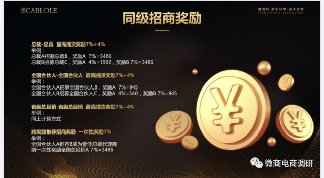 同级招商奖励(推荐奖):经销商小燕介绍说,在嘉珀莉的制度中,推荐比自己等级低的代理没有推荐奖,只有级差奖励,但推荐同级代理就会有推荐奖励。