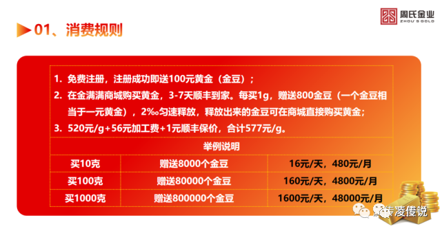 2) 3-7 天顺丰到家。每买 1g,送 800 金豆,2‰匀速释放;买 10 克,送 8000 个金豆,16 元/天,480 元/月;买 100 克,送 80000 个金豆,160 元/天,4800 元/月。