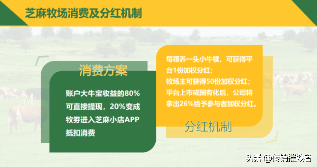 芝麻牧场消费及分红机制:每领养一头小牛犊,可获得平消费方案台1份加权分红;牧场主可获得50份加权分红;平台上市或国有化后,公司将账户大牛宝收益的80%,拿出26%给予参与者加权分红,可直接提现,20%变成牧券进入芝麻小店APP,分红机制抵扣消费。