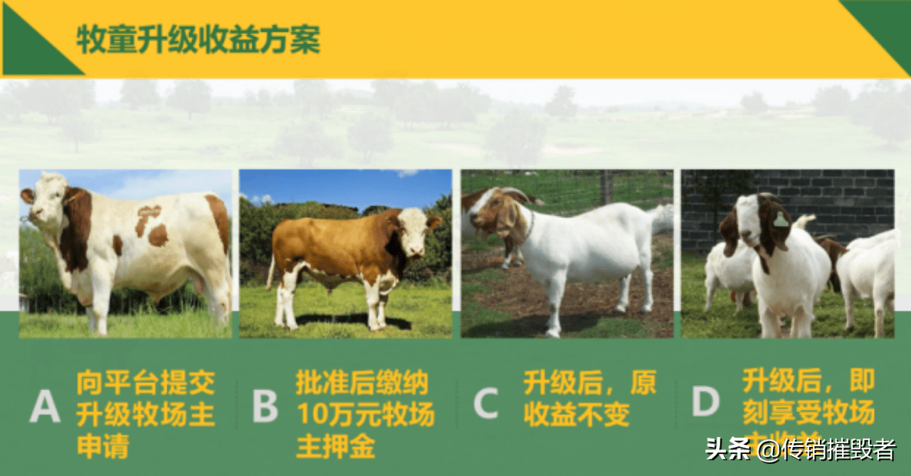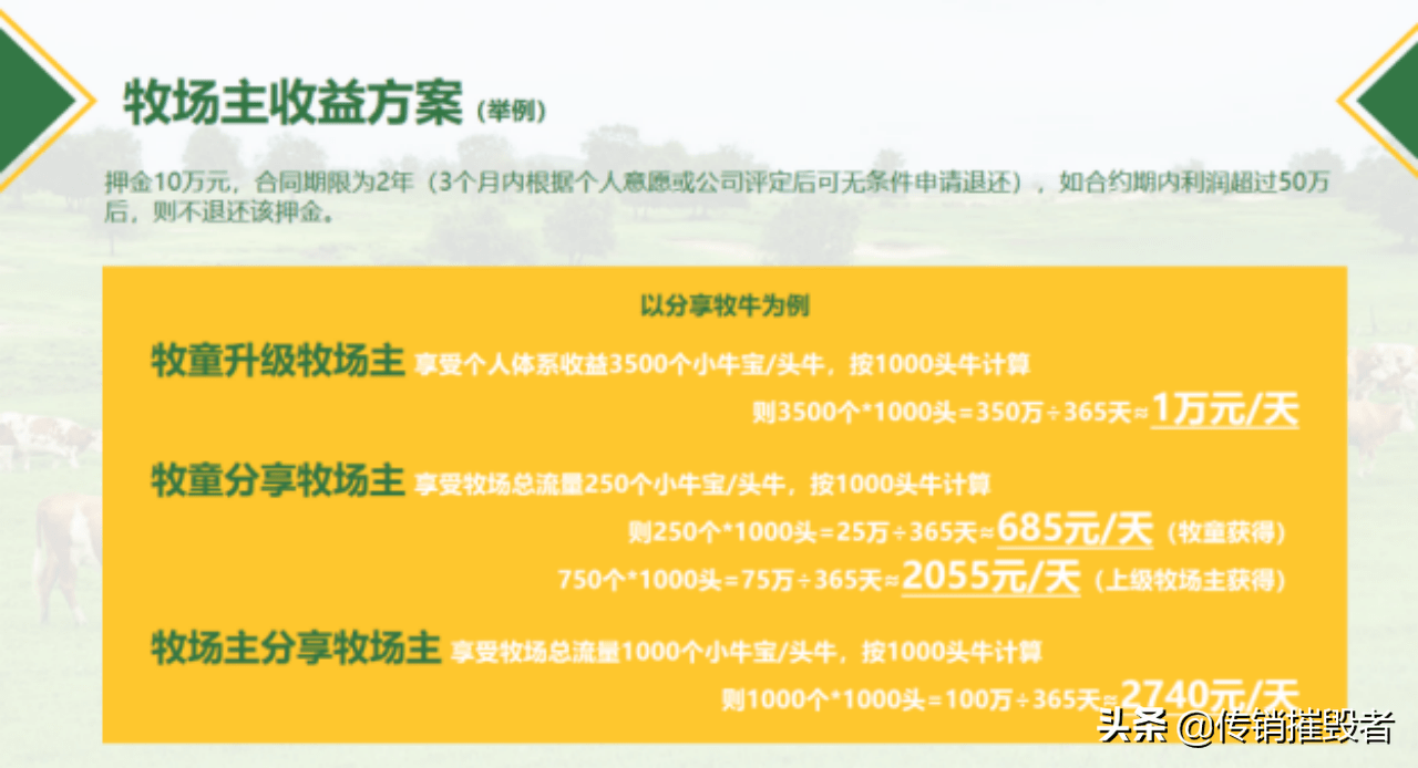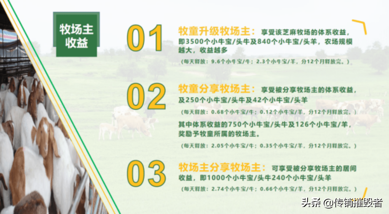 以分享牧牛为例:牧童升级牧场主,享受个人体系收益3500个小牛宝/头牛,按1000头牛计算:3500个*1000头=350万∶365天≈1万元/天。牧童分享牧场主:享受牧场总流量250个小牛宝/头牛,按1000头牛计算。牧童获得250个*1000头=25万∶365天≈685元/天。750个*1000头=75万÷365天~2055元/天(上级牧场主获得):牧场主分享牧场主,享受牧场总流量1000个小牛宝/头牛,按1000头牛计算:1000个*1000头=100万∶365天~2740元/天。