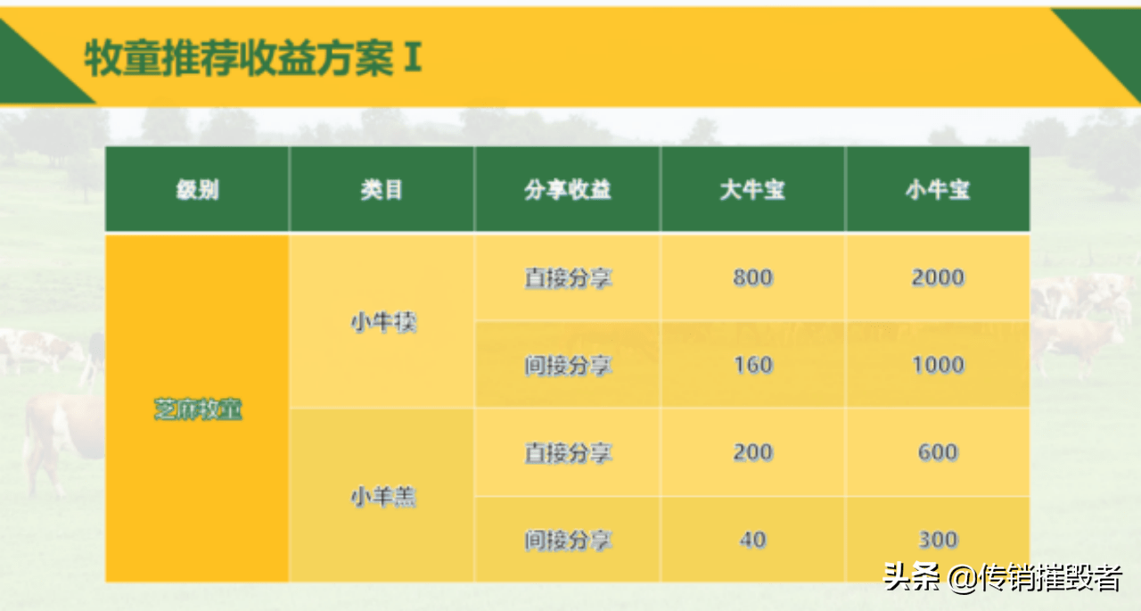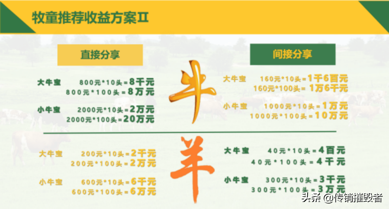 牧童推荐收益方案显示,直接分享(牛):大牛宝,800元*10头=8000元,800元*100头=80000元;小牛宝:2000元*10头=20000元,2000元*100头=20万元。间接分享:大牛宝,160元*10头=1600元,160元*100头=16000元;小牛宝:1000元*10头=10000元,1000元*100头=10万元。
