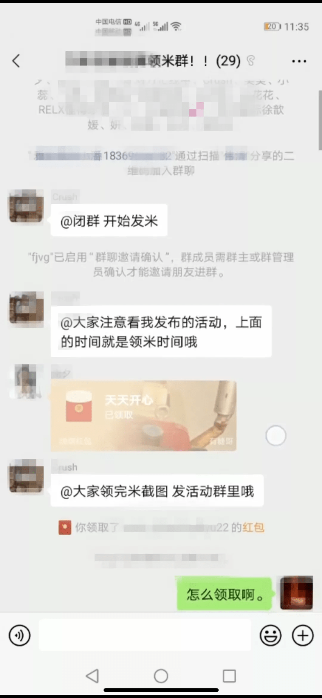发布任务和领取报酬的群,每半天就会进行更换。时间一到,群主就会在群里告诉发布通告,让所有群成员,扫码加入新的群,重新领取任务、领取红包。