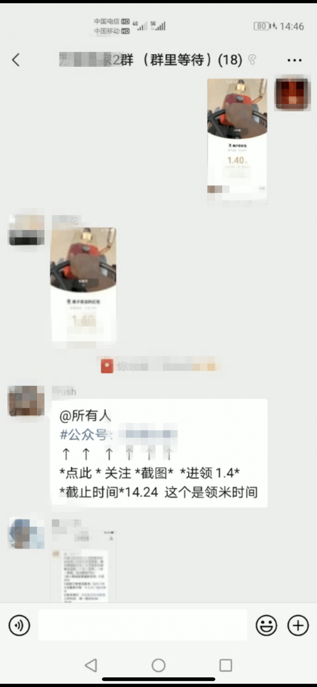 过了一会,群主通知,需要加入“任务群”才能继续领取红包,通过扫描群里的二维码,民警又加入了“2群(群里等待)”,进群后,有三四个群成员会在群里发送任务,最开始的任务是关注微信公众号,并在完成任务后截屏发送到该群,证明自己完成了任务。
