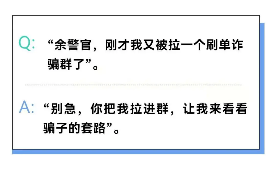 群里一发送这个消息,金某就电话联系民警:“警官,这个肯定是骗子群,跟我之前被骗的套路一模一样,我再也不敢垫钱刷单了”。