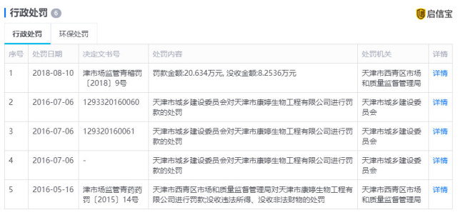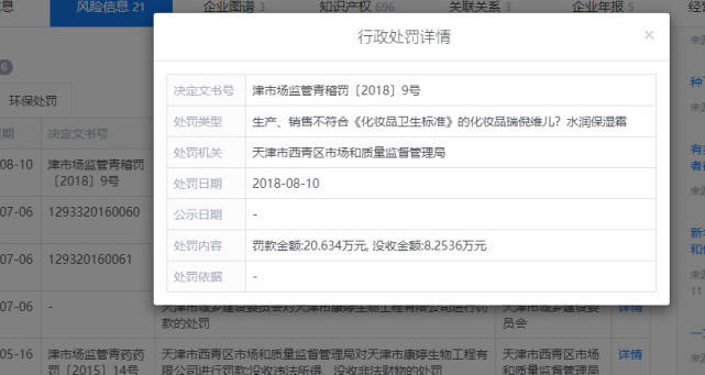 启信宝显示,康婷身背6次行政处罚,最近一次是2018年8月10日,因为“生产、销售不符合《化妆品卫生标准》的化妆品瑞倪维儿水润保湿霜”被罚款20.634万元,没收8.2536万元。2016年5月16日,康婷也曾因为生产、销售不符合法定要求产品被处罚。