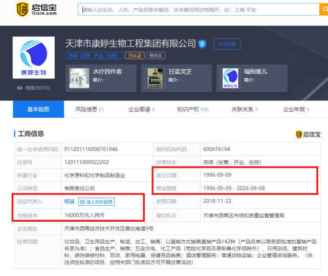 启信宝显示,肖先生所说的康婷是一家以研发、生产、销售健康食品、保健食品和化妆品的生物科技企业,总部位于天津,全称为天津市康婷生物工程有限公司,成立于1996年9月9日,已经有20多年的历史,法定代表人为杨琪,注册资本达1.6亿人民币。