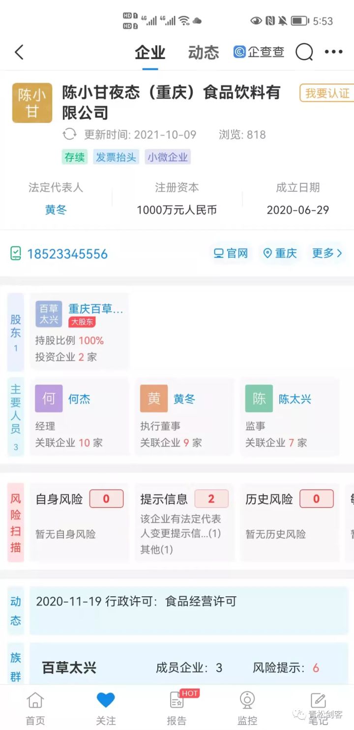 集团旗下有重庆百草太兴生物技术有限公司,陈小甘夜态(重庆)食品饮料公司,根据宣传百草太兴首席研发中医博士陈太兴为陈小甘夜态(重庆)食品有限公司监事