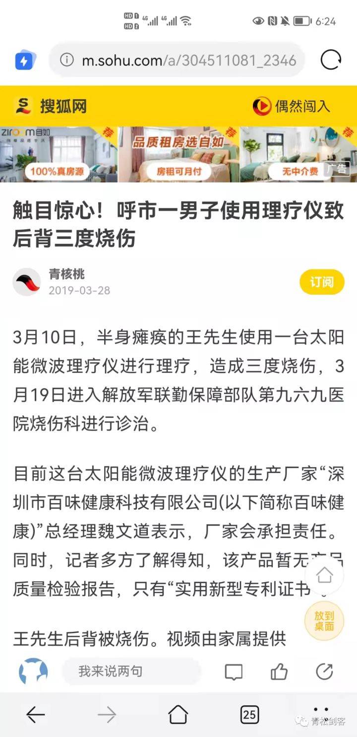 根据相关媒体报道2019年一消费者使用百草太兴太阳能微波理疗仪造成后背三度烧伤而当时该产品并未取得产品质量检验报告。