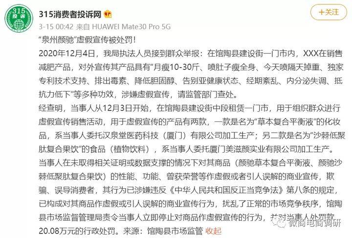 经查明,当事人从12月3日开始,在馆陶县建设街中段租赁一门市,用于组织群众进行虚假宣传销售活动,用于虚假宣传的产品有两款,一款是名为“草本复合平衡液”的化妆品,系当事人委托汉泉堂医药科技(厦门)有限公司加工生产;第二款是名为“沙棘低聚肽复合果饮”的食品(植物饮料),系当事人委托厦门美滋颜实业有限公司加工生产。当事人在未取得相关证明或数据支撑的情况下对其商品(颜驰草本复合平衡液、颜驰沙棘低聚肽复合果饮)的性能、功能、曾获荣誉等作虚假或者引人误解的商业宣传,欺骗、误导消费者,其行为已涉嫌违反《反正当竞争法》第八条的规定,已构成对其商品作虚假或引人误解的商业宣传行为,扰乱了正常的市场竞争秩序,馆陶县市场监督管理局责令当事人立即停止对商品作虚假宣传的行为,并对当事人处罚款20.08万元的行政处罚。这起“泉州颜驰虚假宣传案”最终也名列《馆陶县2020年度消费维权十大典型案例》当中。