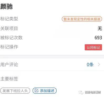 眼下,在腾讯灵鲲金融风险监管平台当中,“颜驰”这个关键词已经被标记了接近700次,虽然标记类型是“暂未发现定性的相关报道”,不过主要标签有“发展下线拉人头”的字样。
