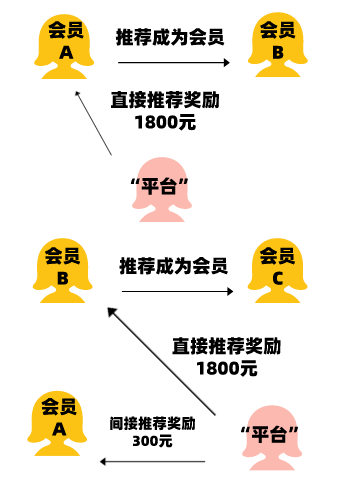 举例,推广会员A推荐B成为推广会员后,可以获得直接推荐奖励1800元;推广会员B推荐C成为推广会员后,推广会员B可以获得直接推荐奖励1800元,推广会员A可以获得间接推荐奖励300元;