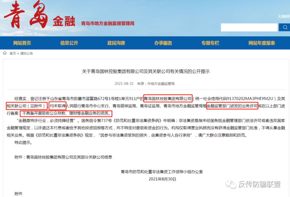 在今年8月份,青岛地方金融监督管理局发布公开提示,直指国商系企业均未取得金融监管部门颁发的业务许可,并不具备开展吸收公众存款、理财等金融业务的资质。