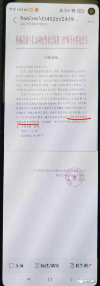 早前,一份网传的文件也显示,济南国林兴业投资有限公司(现更名:济南卓全驰曼科技有限公司)遭到济南高新区打非办的约谈。原因是接到投诉人举报,该公司通过代销外省市金交所的金融产品的形式,向不特定人群承诺预期收益,吸收大量群众参与投资,最后造成不能兑付。