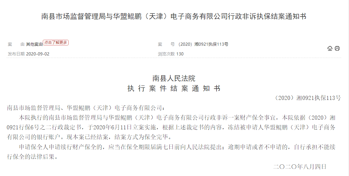 2020年9月2日,中国裁判文书网发文题为《南县市场监督管理局与华盟鲲鹏(天津)电子商务有限公司行政非诉执保结案通知书》(简称:《执保结案通知书》)显示,本院执行的南县市场监督管理局与华盟鲲鹏(天津)电子商务有限公司行政非诉一案财产保全事宜,本院依据(2020)湘0921行保6号之二行政裁定书,于2020年6月11日立案实施,根据上述裁定书的内容,冻结被申请人华盟鲲鹏(天津)电子商务有限公司的银行账户。现本案已经结案,结案方式为保全完毕。申请保全人申请续行财产保全的,应当在保全期限届满七日前向人民法院提出;逾期申请或者不申请的,自行承担不能续行保全的法律后果。