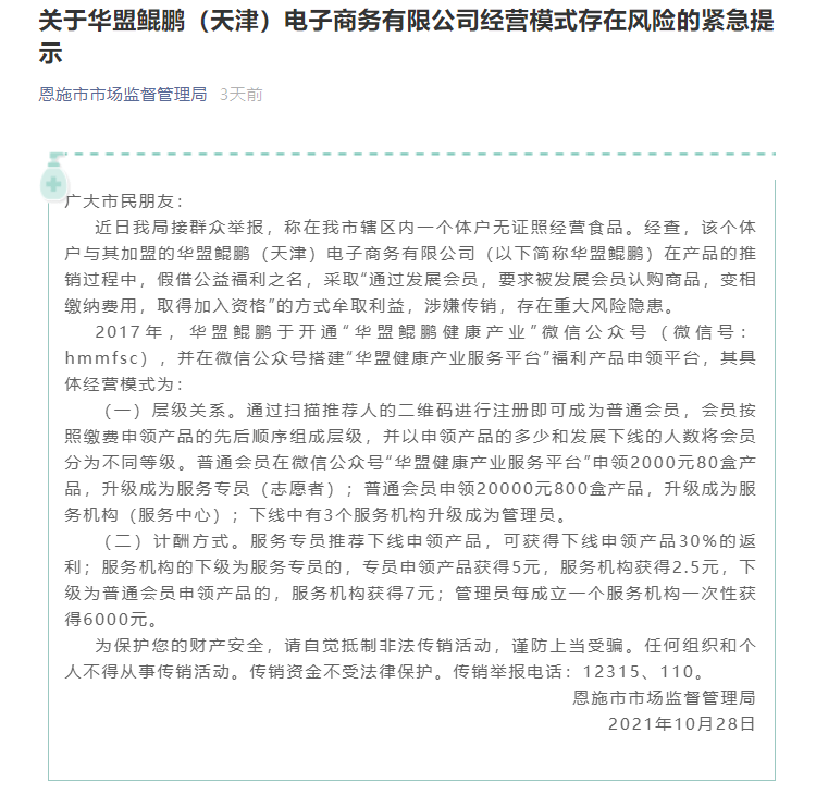10月28日,微信公众号名为“恩施市市场监督管理局”发布题为《关于华盟鲲鹏(天津)电子商务有限公司经营模式存在风险的紧急提示》(简称:《紧急提示》),据《紧急提示》显示,近日我局接群众举报,称在我市辖区内一个体户无证照经营食品。经查,该个体户与其加盟的华盟鲲鹏(天津)电子商务有限公司(以下简称华盟鲲鹏)在产品的推销过程中,假借公益福利之名,采取“通过发展会员,要求被发展会员认购商品,变相缴纳费用,取得加入资格”的方式牟取利益,涉嫌传销,存在重大风险隐患。