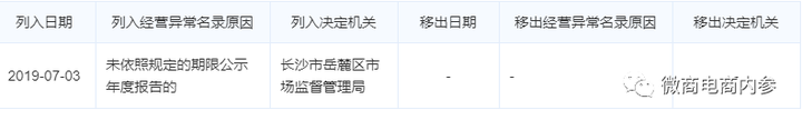 而该食品店早在2019年7月就已因未依照规定的期限公示年度报告而被长沙市岳麓区市场监督管理局列入经营异常名录之中,至今未被移除。