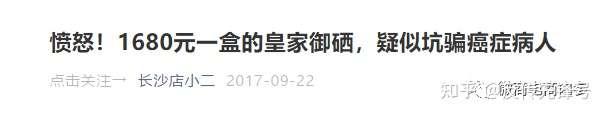在这起事件曝光后,公众号“长沙店小二”曾以《愤怒!1680元一盒的皇家御硒,疑似坑骗癌症病人》为题对皇家御硒产品的虚假宣传事件发声:“皇家御硒”是否违法,违了哪些法,是否坑了人,坑了多少人,有待食药监、工商甚至公安部门调查。如果该产品确实诈骗了癌症患者和家庭,其人其心可诛!
